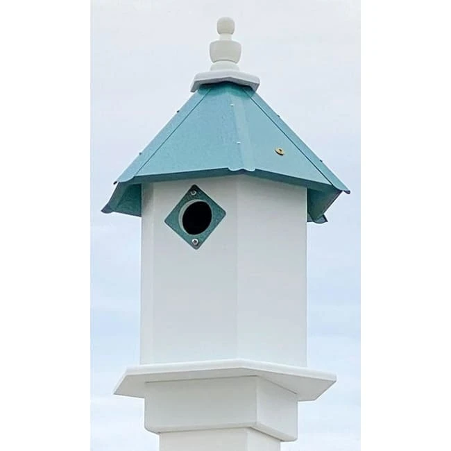Highlight natural hues, lasting materials, and your love of birds by placing this Wing and A Prayer Bluebird Hexagonal Bird House with Verdigris Roof in your yard. Displaying this six sided unit within your landscaping provides bluebirds and other songbirds a welcome resting spot, and lends a classic look to the area. The 1.5″ diameter entry hole sits high on the white, PVC body, creating a deep nest box design that helps keep bluebird or other nestlings safe from predators. The hexagonal roof and extended base plate further the geometric hint, and a top, wooden finial completes the piece. The soft green finish on this PVC roof, its metal tines, and the metal guard around the entry hole lend wonderful tones to the unit, and the finial removes from the roof for nest checks. Slide the attached mounting collar over a true 4″ x 4″ post to situate this shelter at a great height for your feathered friends. The PVC lumber construction remains lovely without peeling, rotting, or delaminating, and the white and verdigris colors add a traditional hint. Adorn your garden with a dynamic and geometric new roosting spot using this Bluebird Hexagonal House with Verdigris Roof. Made in the USA.