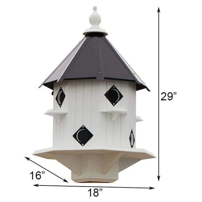 Showcase your love of purple martins with the Wing and A Prayer Purple Martin Castle House. This regal dwelling offers a lovely and secure roosting spot for martins, while adding a bold centerpiece to your yard. The two story, octagonal home has eight separate apartments, for a sizeable colony. Each apartment has a 2″ diameter entry hole, surrounded by a metal predator guard for added protection and design. An octagonal base supports the home, creating perches for the four bottom level apartments. Single perches beneath each upper level opening create needed landing spots for the birds, while preventing porch domination. The individual apartments are triangular, narrowing at the back and offering martin families a wonderful nesting spot. A significant, black metal roof covers the home, its octagonal shape echoing that of the structure. The unit is crafted from PVC trimboard, designed to withstand seasons of use without delaminating or mildewing. The white PVC remains stable for 25 years, offering a lasting home and, combined with the black roof, lends a classic color scheme to the piece. A wooden finial completes the roof, which can be fully removed for seasonal cleanouts. The all-PVC divider easily lifts out of the home, for end of the year maintenance. A mounting collar is permanently attached to the base of the item, and can accommodate a true 4″ x 4″ wooden post (not included) for secure mounting. Place an inspiring and majestic home in your yard with this Purple Martin Castle House. Made in the USA.