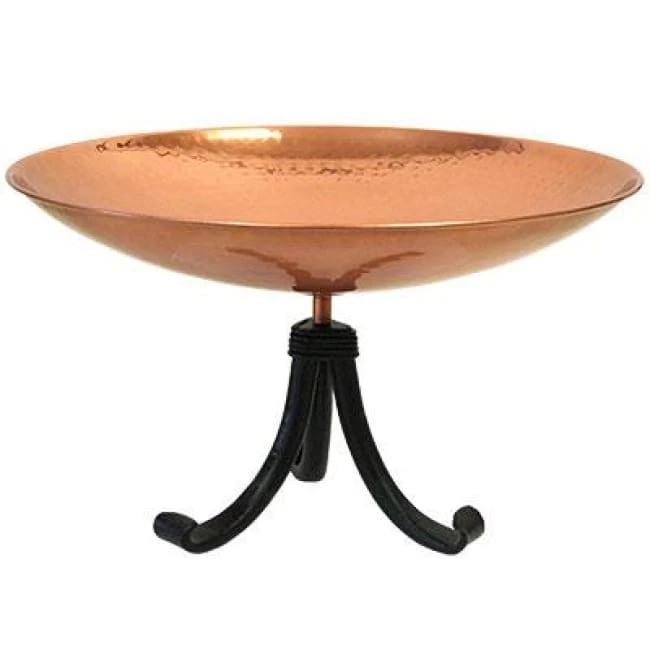 Showcase both birds and classic style in your garden using this Achla Copper Plated Metal Bird Bath with Tripod Stand. This durable bath and stand combination brings an elegant hint to your landscaping with ease, while helping you care for your feathered friends. The generous, 14″ diameter, metal bowl holds plenty of water, while a hammered texture throughout it provides gripping spots for small birds. Its vivid, polished copper plated finish adds a bright and beautiful effect, and will patina over time for an ever changing accent. Install the included, wrought iron stand into the threaded port on the base of the bowl, to rest it on a tabletop or other level surface easily. The three legs on this wrought iron base provide plenty of stability, and its black, powder coated finish adds a dynamic contrast. The traditional hues and lasting construction combine for an eye-catching garden accent, sure to remain a favorite avian gathering spot season after season. Bring bright style to your deck or garden table with this Copper Plated Metal Bird Bath with Tripod Stand. Some assembly required.