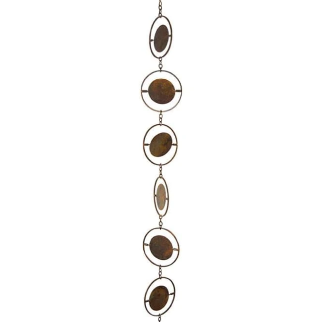 Visually celebrate the cycle of the seasons with this Ancient Graffiti Circle Rain Chain. This lengthy, iron piece brings both geometric style and fantastic function to a corner of your home in moments, thanks to its solid and open circles. Rain chains handily replace downspouts, gently directing water from your gutter to the ground, and lend a bit of design to an abode. The striking, flamed copper colored finish throughout this piece enhances your landscaping, and its 96″ length reaches easily to the ground. An included, metal gutter clip aids in installing the item properly, and rings may be removed for a custom size. Square iron bars form each exterior ring, connected to the ones above and below with chain links, and the flat, center disc lends color and dimension. Water gently travels down these rings into a basin or barrel for use later, helping conserve this resource. The circular design throughout the item highlights natural cycles, while the iron construction remains durable for many seasons. Add defined shape to one corner of your home’s exterior using this Circle Rain Chain.