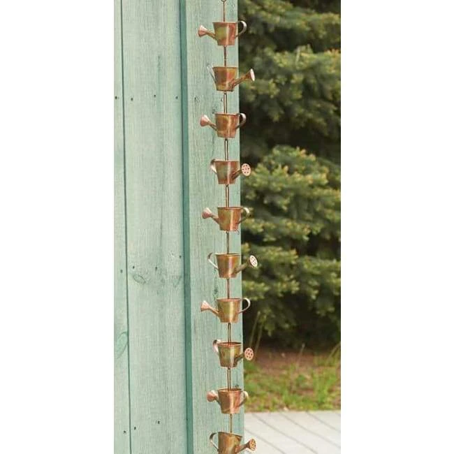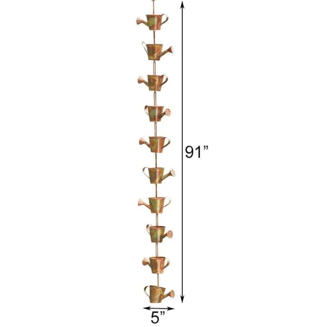 Highlight your love of gardening in a whimsical way with the Ancient Graffiti Watering Can Rain Chain. For centuries, rain chains have been used to direct water away from the sides of buildings, and this piece will certainly accomplish this while bringing a bold look to your home. Miniature watering cans create this adorable chain, and their flamed copper colored finish meshes with the outdoors. A generous link connects each can to the next, furthering the chain motif, and these help direct water down the piece for a fantastic look. Place a rain barrel or other container beneath the chain, for saving rainwater for use in the garden. Each of these links and cans may also be removed for a custom size, and the steel construction lasts for seasons of use. An included, steel gutter clip installs securely in the drain hole of your gutter, and supports the chain for a unique home accent. Bring a charming look to your home and help direct rainwater to a basin with this Watering Can Rain Chain.
