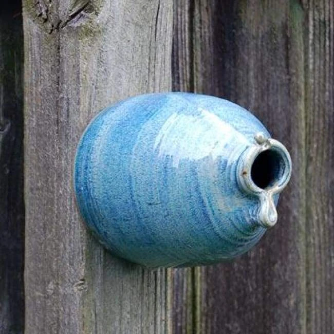 Add this Anthony Stoneware French Blue Peek-A-Boo Ceramic Bird House to your bird garden for an in-depth look at avian nesting activity. This charming and durable shelter is perfect for small songbirds, and its rounded shape adds an exciting look to the garden. The 5″ diameter, flat back of this home affixes to a fence, wall, post, or tree with its included screw and keyhole slot. The unit tapers toward the front, and a 1.25″ diameter entrance hole here enables chickadees or wrens to use the shelter. Its light blue glaze meshes with your landscaping, while its textured finish enhances the handmade appeal. Each home is fired to 2400° Fahrenheit to ensure durability and resistance to ultraviolet light, for a piece you and your birds can enjoy for many seasons. Watch bird nesting behavior in your backyard with this French Blue Ceramic Peek-A-Boo Bird House. Made in the USA.Â
