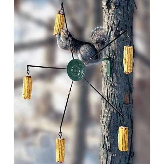 Watch squirrels dine and play simultaneously in your garden from this Heritage Farms Medallion Squirrel-Go-Round. Providing these animals their own feeding station can discourage them from overtaking your bird feeder, and this unit brings a fun element to the yard as well. A metal medallion with raised leaf detailing forms the feeder hub, and five metal arms extend outward from it. Each of these arms culminates in a threaded screw, perfect for holding an ear of corn or squirrel log. Attach this assembly to the included, metal bracket, which affixes to a tree trunk or wall in moments. As a squirrel grabs for the treat, its weight spins the center medallion, lending a surprising element to the feeder. The metal body remains durable for several seasons, and the green and black colors offer a traditional look. Divert squirrels’ attention to their own feeding spot by adding this Medallion Squirrel-Go-Round to your yard.