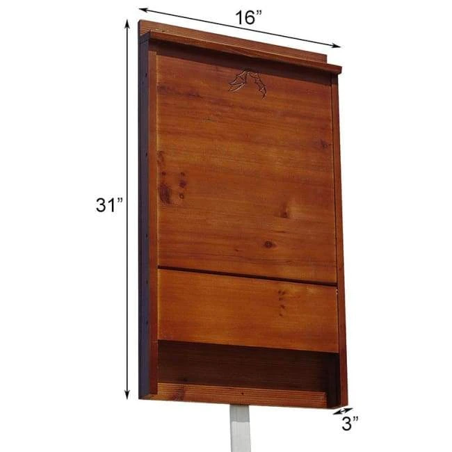 Invite beneficial bats to roost in your yard in the BestNest Premium Stained Bat House. Meticulously designed to meet the needs of a colony, this single-celled home has a wealth of features to help achieve a high occupancy rate. The interior surface and reinforced landing platform are crafted from deeply grooved wood, creating an excellent clinging surface on which bats may land. The single chamber measures 1″ deep, and offers enough space for 100 bats. The house’s exterior grade stain provides a lovely and natural-looking finish, and will also absorb heat while protecting the colony from the elements. The 0.25″ ventilation slat in the front helps to regulate temperature and increase air circulation, and the 4″ long, bottom landing platform enables several bats to land at once. The sides of the home extend downward, bringing extra strength and durability to this platform, and a slanted roof with a tongue and groove assembly keeps the interior dry and safe from the elements. A beautifully designed emblem of a bat in flight adorns the front of this shelter, and the furniture grade wood construction is built to last. This house may be mounted to a vertical surface with any of the three predrilled holes at the top and single stabilizing hole at the bottom. Offer a home to helpful bats with this Premium Stained Bat House.