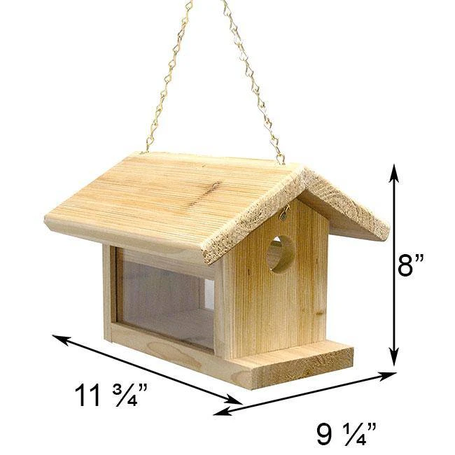 Add a fantastic bluebird dining spot to your backyard using this C&S Bluebird Feeder. This feeder blends rustic style with practical function, for a wonderful addition to your bird garden. An expansive, wooden roof shields both feed and birds from the elements, and a 1.625″ diameter entry on one side of the piece allows bluebirds to reach their treat. The center reservoir holds 0.75 quarts of mealworms, suet nuggets, or mixed seed, and a 1.625″ long, extended front platform provides perching and dining room for your feathered friends. The two clear, plastic side panels keep the avian activity visible. An integrated metal chain runs through the pitched roof, making it simple to hang the feeder, and the roof lifts up the chain for easy refilling. The hardy, wood and plastic construction last for many seasons while also bringing a classic look to your yard. Provide mealworms or bluebird nuggets to the birds in your area with this Bluebird Feeder. Made in the USA.
