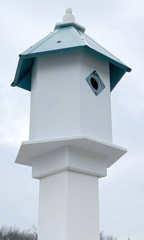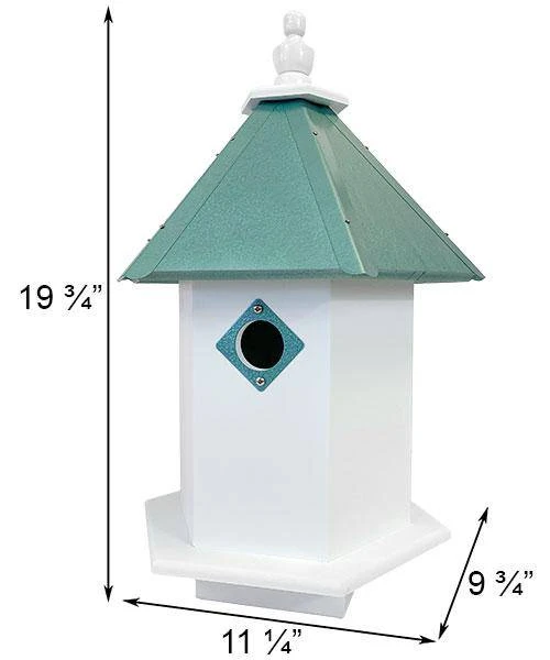 Celebrate protective trees and provide lasting shelter to two small songbird families by adding this Wing and A Prayer Sycamore Bird House with Verdigris Roof to your backyard sanctuary. The classic color scheme and contemporary materials combine to form a durable nesting site, while creating a fantastic statement in your landscaping. The white, hexagonal PVC body has plenty of room for two avian families, and dual, 1.5″ diameter entry holes on opposite sides of the shelter provide passage to wrens and chickadees. A light green, metal plate surrounds each entry hole, preventing woodpeckers and other birds from enlarging them, and each rests near the roof for a deep nesting area. A hexagonal, PVC roof keeps the interior dry and warm for your feathered friends, and its textured, light green finish and metal tines lend extra angles and visual interest. An extended, bottom platform creates perching area for small birds, and the top, wooden finial adds height to the unit. This topper can also be removed for seasonal nest checks, and its white color matches that of the shelter. Slide the bottom mounting collar over a true 4″ square post for a convenient and lasting display. The PVC body and roof ensure style and longevity, without peeling, rotting, or delaminating from exposure to the elements. Bring a bit of divine and arboreal style to your bird garden with this Sycamore Bird House with Verdigris Roof. Made in the USA.