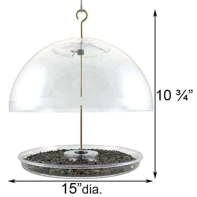 Dorothy’s Cardinal Feeder is perfect for songbirds. This feeder features a large 15″ dome that serves to protect the feeder tray from squirrels, undesirable birds, and the elements. The unique versatility of this feeder allows you to limit the access of undesirable squirrels and birds by adjusting the distance between the dome and feeder tray. Move the dome closer to the dish and the feeder becomes songbird selective. The 13″ diameter feeder tray is 1″ deep and will accommodate a virtually endless variety of bird foods including 0.75 quarts of seed, suet, and table scraps. Simply slide the feeder dome up the included hanging rod or unscrew the feeder tray for quick and easy cleaning and filling. The feeder dome and tray are clear plastic to keep the birds and the seed level visible at all times. This feeder may be hung with the included 10.75″ solid brass hanging rod or post mounted using any pole with a 0.75″ threaded adapter (not included). Made in the USA. Lifetime Guarantee.
