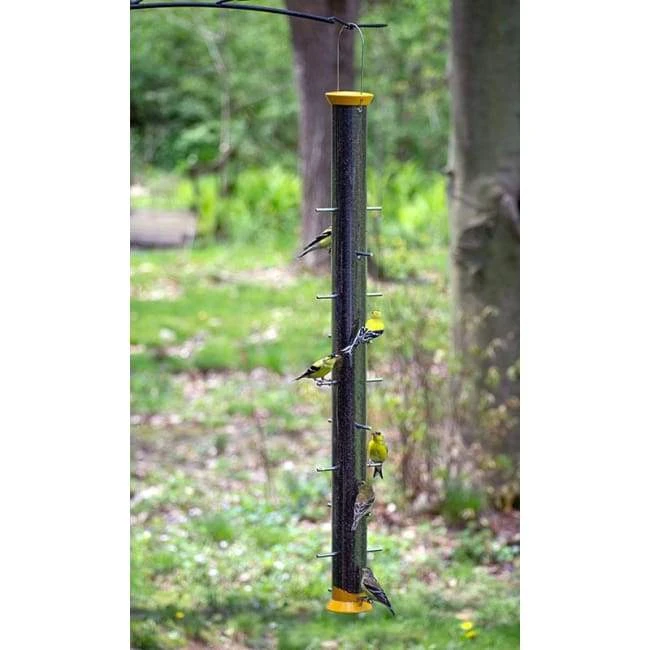 The Droll Yankees New Generation Finch Flocker Bird Feeder features an excellent design that will make a wonderful addition to any backyard sanctuary. Birds may rest comfortably at any of the twenty individual perches at the thistle seed ports. The clear, UV stabilized polycarbonate feeder tube keeps the seed level visible at all times and is perfect for holding 2.5 quarts of seed. An internal seed baffle design directs seed to the ports so that the feeder empties completely without leaving a dirty residue. Simply slide the die-cast metal cap up the hanger for quick, convenient cleaning and filling. With its durable construction, the Droll Yankees New Generation Finch Flocker will serve the birds in your wildlife habitat faithfully, season after season. This feeder may be hung on the included metal loop hanger or pole mounted using any pole with a 3/4″ threaded adapter (not included). Made in the USA. Lifetime Guarantee.