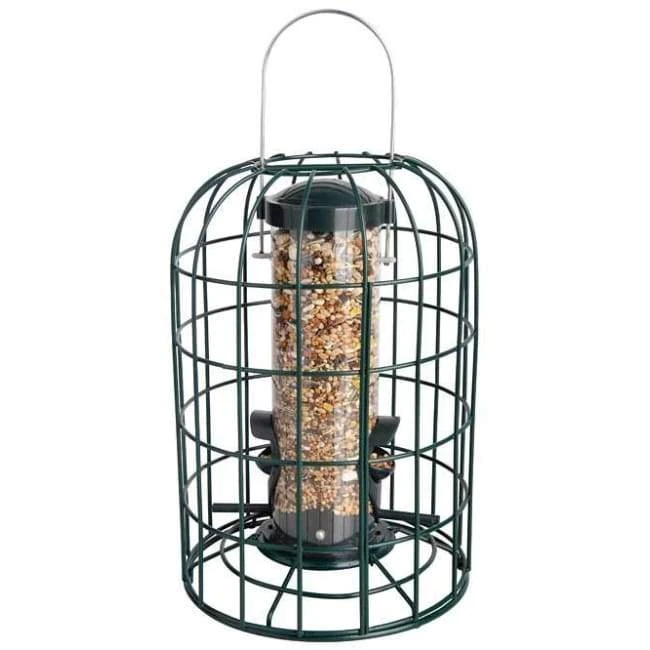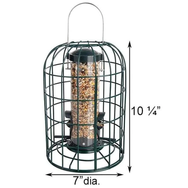 Create a feeding area just for small birds using the Esschert Design Caged Tube Bird Feeder. Covering a traditional feeder with a wire cage helps protect it from large birds, so smaller birds can dine undisturbed. The center, 2.625″ diameter tube holds 0.5 quarts of sunflower seed, safflower seed, or cracked corn, accessible via the two bottom ports. Twist the port openings 180° to feed thistle instead, offering a treat to different birds. A green metal cage surrounds this seed tube, and its 2″ long and 1.375″ wide openings allow only small birds to reach the unit. Place this feeder on a hook or bracket with the included metal hanger, for both you and your birds to enjoy it. When not suspended, the cage lifts easily from the feeder for thorough cleaning. The cap may also be lifted at this time to refill the piece, and the green color blends with your garden. Its plastic tube, ports and lid create a family-friendly unit, while the metal grid and hanger add durability. Keep your small songbirds fed with this Caged Tube Bird Feeder.Â