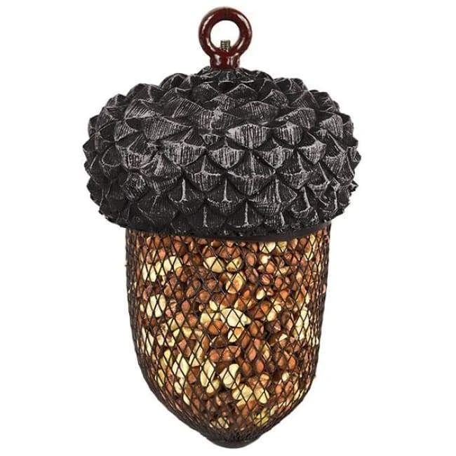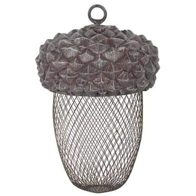 Watch the birds in your backyard go nuts feeding from this Esschert Design Acorn Mesh Bird Feeder. The realistic acorn shape of this item lends a whimsical look to your yard, while its hardy construction lasts for many seasons. A textured, resin cap with overlapping scales supports the tapered, mesh base, creating a familiar and fun acorn shape in moments. This reservoir accommodates 0.75 quarts of sunflower seeds or peanut chunks, and its diamond-shaped grid enables clinging birds to dine. Suspend this item from a bracket or other hanger using its top metal loop, which can also be unscrewed for opening and refilling the piece. The brown and black hues enhance the natural effect, and the metal and resin body offers longevity. Provide select songbirds an exciting and adorable dining spot with this Acorn Mesh Bird Feeder.