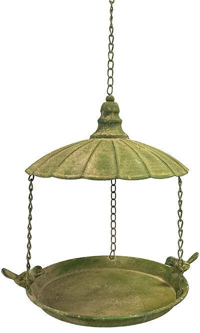 Offer birds a fanciful dining retreat using this Esschert Design Green Aged Metal Hanging Bird Feeder. The circular base with dual metal bird figures adds a fun look to your bird sanctuary, furthered by the matching, domed top with raised lines. A generous finial and slight uneven edge on this cap evoke a circus tent, while the finial brings extra height to it. Three chains suspend the roof over the base tray, which holds 0.75 quarts of mixed seed, suet nuggets, fruit, or mealworms. A slightly flared edge keeps the feed in place, and the aged green finish throughout the piece adds an antique effect. Crafted from metal, the feeder remains durable for many seasons, and a 12″ long chain with top hook makes it simple to place this item on a bracket or branch. The miniature bird figures on the edge of the tray bring a charming hint to any setting, while the open design makes it easy to watch all of the avian activity. Help a few birds remain well fed by placing this Green Aged Metal Hanging Bird Feeder in your yard.
