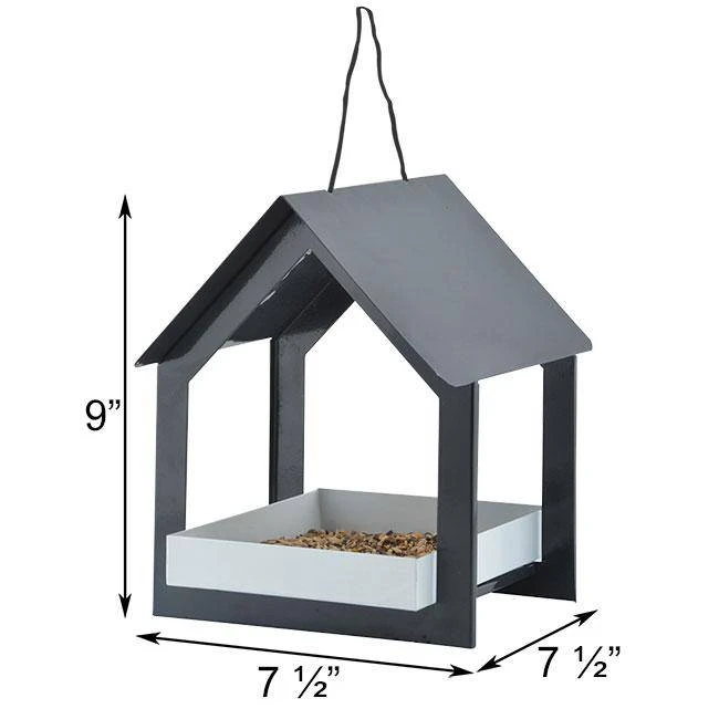 Keep food dry, fresh, and available for your feathered friends with this Esschert Design Black and Gray Hanging Fly Through Bird Feeder. This adorable, steel unit perfectly evokes a house, thanks to its squared frame and steeply pitched roof. A gray, bottom platform sits inside this black frame, easily holding 0.5 quarts of seed, suet, or fruit to feed a bevy of birds. The extended roof protects the feed from the elements, and the open sides create a fly-through design, for several birds to dine at once. A hole in each corner of the platform enables any water to drain, and an attached, fabric hanger allows you to suspend the feeder from a hook or bracket. The frame extends downward below the reservoir for resting the unit on a level surface, and the steel construction lasts for many seasons of service. The gray and black tones add a contemporary hint to your landscaping, and the coated finish protects it from harsh weather. Add a traditional feeding station with bold colors to your yard with this Black and Gray Hanging Fly Through Bird Feeder.