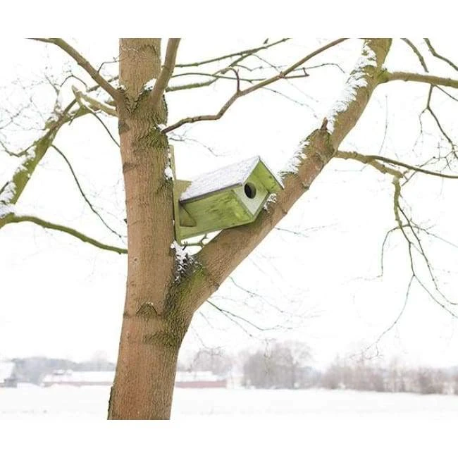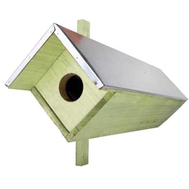 Add a unique nest box to your backyard for birds of prey with this Esschert Design Extended Horizontal Owl or Kestrel House. Providing these vital birds a shelter in your backyard adds natural pest control to it, while allowing you to enjoy an overlooked part of nature. The clever design and unique mounting system for this home bring a fresh look to your yard, and its soft green color enhances the setting. Its 26″ deep nesting area has both a front and back compartment, dividing the unit for the safety of nestlings. Owlets often will use a second nest box as a protected dining area, and this divided roost provides this easily. The 2.75″ diameter entry hole allows small owls to enter the shelter, and the significant overhang protects this opening from rain. The peaked roof, covered by silver colored metal, lends style to the home, while its pine construction ensures it remains a proper temperature for the birds. The included wooden plank attaches to the side mounting blocks with the included screws, enabling you to secure this home against a tree, wall, or post. Predrilled holes in the plank and blocks make installation simple, and you can remove the house from its mounted area for seasonal cleanings. Supply an innovative roost for birds of prey with this Extended Horizontal Owl or Kestrel House.