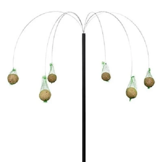 Create a tropical hint in your yard and offer treats to several birds using this Esschert Design Black Palm Tree Suet Ball Hanger. This unique and versatile piece is simple to install in your garden soil, and easily accommodates suet balls to delight your feathered friends. A flattened and pointed end on the 53.25″ long, steel shaft inserts into soil with ease, and 6 metal rods fan outward from the top of this tube. Each rod culminates in a small hook, perfect for holding a mesh bag with a suet ball, and their gray hue contrasts the black of the pole. These flexible hangers allow only small birds to balance and dine, and arc outward in a striking umbrella effect. Gather the galvanized rods together and slide them into the steel shaft for compact, seasonal storage. Its coated finish protects the unit from elemental wear, and the all metal construction is perfect for year round use. Add hanging room and an arboreal motif to your bird sanctuary with this Black Palm Tree Suet Ball Hanger.
