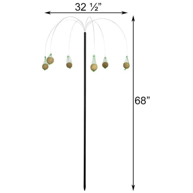 Note: This description refers only to the Esschert Design Palm Tree Suet Ball Hanger, Black, 5’8″. The suet balls and nets shown are not included.