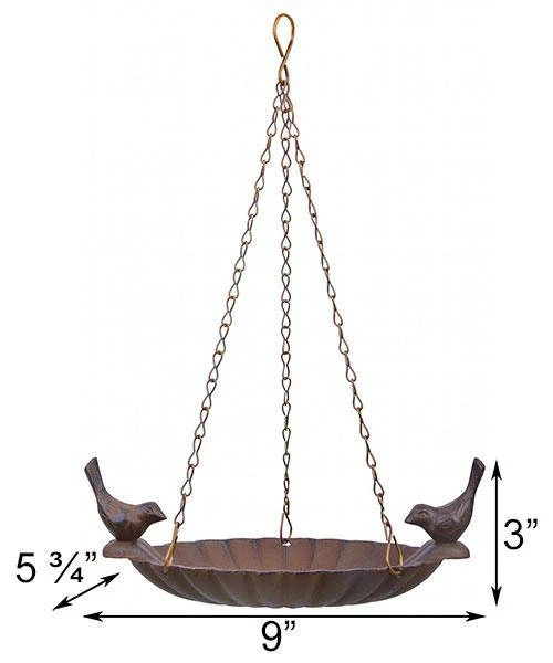 Provide a few birds with a charming water source by adding this Esschert Design Petite Hanging Bird Bath with Bird Accents to your yard. This fantastic, cast iron bath brings a bit of style to your garden, and offers one or two birds a convenient drinking spot. The scalloped design of the basin creates an elegant silhouette, while lending texture to the bowl for a safe bathing spot. Two bird sculptures rest on the edge of this bowl, appearing to be ready to drink. The deep brown color and black accents on this item add an aged look, and the attached chain makes it simple to hang the piece. The color scheme not only enhances your landscaping; it also highlights the durable, cast iron construction. Add a fun preening spot for a few birds to your garden using this Petite Hanging Bird Bath with Bird Accents.
