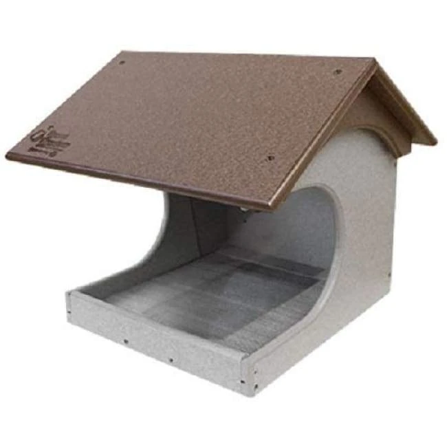 Provide your favorite backyard birds seed and a sheltered feeding spot with this Brown and Gray Polywood Recycled Plastic Cardinal Platform Bird Feeder. Blending the convenience of a platform feeder with the protection and capacity of a hopper, this innovative piece is a fantastic addition to any bird sanctuary. Durable, recycled plastic lumber forms the base, sides, and pitched roof of this piece, for a wonderful, environmentally sound station. A clear plastic panel beneath the roof creates the reservoir, accommodating 4.75 quarts of mixed seed or peanut splits with ease. Feed empties onto the metal base for birds to reach it, and the perforations here help it remain dry and fresh. A plastic slat and extended rails beneath the screen enable you to post mount the feeder, and the significant roof swings upward for straightforward refilling. The front panel also removes for thorough cleaning, and the recycled plastic frame ensures longevity. Its brown and gray hues enhance the natural tones in your backyard, while the fun design offers versatility in the feed it can hold. Identify a wealth of different songbirds and provide them a variety of feed in this Brown and Gray Polywood Recycled Plastic Cardinal Platform Bird Feeder. Made in the USA.