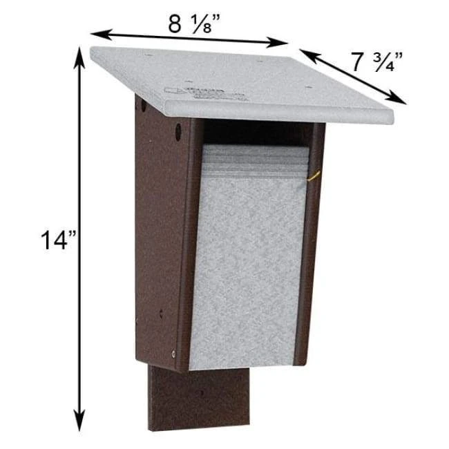 Add a unique bluebird roosting spot to your yard with this Polywood Gray and Brown Recycled Plastic Sparrow Resistant Bluebird House. Providing musical bluebirds a shelter specifically designed for their needs can help increase their populations, and this unit can also discourage house sparrows from roosting. Made by the Amish from recycled plastic milk jugs, this environmentally friendly roost box sports a generous, overhanging roof and innovative, slot shaped entry. Routed lines beneath the entry help bluebirds grip it without a perch, and the shape often deters sparrows. The roof protects the interior from rain and snow, and ventilation holes beneath it keep the nestlings from overheating. Gaps on the base allow any captured water to drain for added avian safety. The front panel opens downward for nest checks, and the lengthy back panel with predrilled holes makes placement against a post or wall simple. The dark brown body and gray roof lend a natural hint to the unit, while the recycled plastic construction provides durability with little maintenance. Stainless steel hardware offers even more strength and longevity, and the thoughtful design brings bluebirds’ needs to the forefront. Encourage lovely bluebirds to roost in your yard by placing this Polywood Gray and Brown Recycled Plastic Sparrow Resistant Bluebird House in it. Made in the USA.