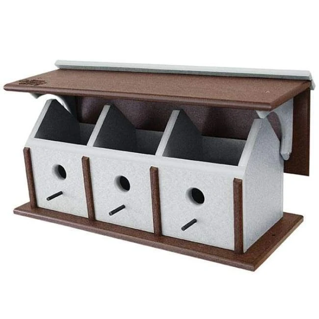 Increase the birding activity in your garden by placing this Polywood Recycled Plastic Horizontal Triple Wren House in it. This significant unit is perfect for communal birds, providing three separate nesting spots within one convenient frame. A dark brown, recycled plastic roof, base, and vertical posts bring a natural hint to the unit, while gray side panels offer a bit of contrast. Each of the three front panels has a 1.125″ diameter entry hole, for small songbirds to enter and roost, and a perch beneath each circle creates resting spots. The pitched roof ensures the shelters remain both dry and well ventilated, and lifts upward for nest checks and seasonal cleaning. The soft gray hue of the body further prevents birds from overheating, while the flat base allows you rest the unit on a table for a striking display. Add a mounting bracket (not included) for post mounting the piece. Crafted from recycled milk jugs, the shelter brings an environmentally friendly hint to your garden, and the natural tones further the motif. Offer a few small birds shelter easily by placing this Polywood Recycled Plastic Horizontal Triple Wren House in your yard. Made in the USA.