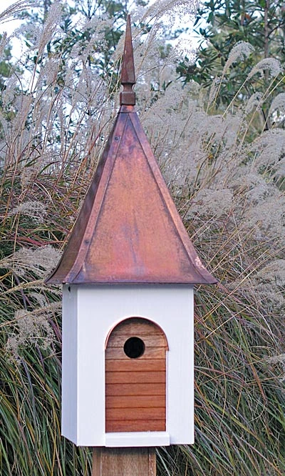 Add a sophisticated look to your bird sanctuary with the Heartwood French Villa Bird House. The white and brown colors, durable materials, and square shape of this unit combine for a distinctive look, and provide small songbirds a lasting and lovely roosting spot. The square body of the shelter, crafted from cellular PVC, forms a beautiful and low maintenance structure, for you and your birds to enjoy season after season. A mahogany door sits on the front panel of this abode, with copper molding at its top for a bright accent. A 1.5″ diameter entrance hole rests in this mahogany panel, contrasting the drop siding here, and allowing birds to access the shelter. A solid copper, hipped roof tops this home, flaring outward at the base for full protection from the elements. Its aged finish creates a timeless effect, while the generous, cast iron finial at the top completes the unit. A drainage hole on the base of the home helps the nest remain dry, and a copper disc on the back of the piece allows for seasonal nest checks and cleanouts. Use the included mounting plate to attach this home to a 4 x 4 post (not included), for a sturdy and attractive display. The cellular PVC body creates a lasting home which requires little maintenance, and can even withstand exposure to high humidity and freezing without cracking or warping, keeping the unit lovely for many seasons. Bring a bit of the French countryside to your bird sanctuary with this French Villa Bird House. Made in the USA.