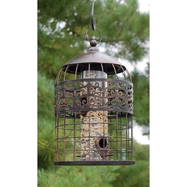 Provide your backyard birds a majestic feeding spot with the Heath Grand Palace Caged Bird Feeder. This ornate, caged unit allows you to feed your favorite small birds, while deterring squirrels and larger birds from dining. A band of metal curls surrounds the top section of the cage, and bronze tones throughout this area gleam in sunlight for a striking effect. The 1.375″ square openings on the grid offer passage to smaller birds, and a solid metal top and orb complete the unit. A 2.75″ diameter seed tube rests inside this metal frame, easily holding 0.8 quarts of cracked corn or safflower seed. The four, reinforced metal ports help birds reach their treat, and a perch on each port offers them a resting spot. A raised base on the seed tube forms a baffle, preventing a dirty residue, and a metal tray at the base provides extra dining spots. The item disassembles for thorough cleaning, and a top loop makes hanging the piece simple. Its plastic and metal construction is great for seasons of use, while the clear reservoir helps you monitor seed levels at a glance. Place a remarkable feeder in your garden with this Grand Palace Caged Bird Feeder.Â