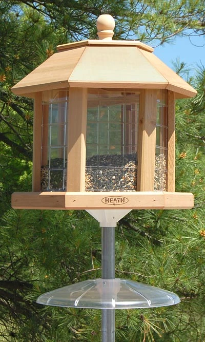 Feed an entire flock of birds in your backyard using this Heath Le Grande Gazebo Bird Feeder Combo. This package makes it easy to display a feeder in your yard, while discouraging squirrels from dining. The hexagonal, cedar frame and plastic panels create the generous hopper feeder, which holds an astonishing 11.5 quarts of seed to keep birds well-fed for some time. The clear panels ensure feed levels and all your backyard birds remain visible, and gaps on the base of each allow them to reach their treat. The included seed scoop makes it simple to fill the piece while remaining tidy, and the roof fully removes to accommodate this. Place this significant reservoir on the included, telescoping metal pole for a fantastic and versatile display. An included, plastic ground socket installs into soil to support this pole, and a plastic mounting bracket holds the feeder in place atop it. Key locks keep the three metal pole sections at the right extension, and each can be twisted and removed for raising and lowering the feeder as desired. A 13.375″ diameter, plastic baffle also slides onto this pole, shielding the feeder from squirrels, and a finial threads onto the feeder roof to prevent animals from lifting it and pilfering seed. Crafted from rot-resistant cedar, hardy plastic, and robust metal, this feeding station brings a classic look to your garden for many seasons, and the brown tones on the frame accent your existing flora. The large size and six sides of the feeder allow several birds to dine with ease, and the included pole enables you to place it in an open spot in your landscaping. Supply birds a lasting food source by adding this Le Grande Gazebo Bird Feeder Combo to your yard. Assembly required. Made in the USA.