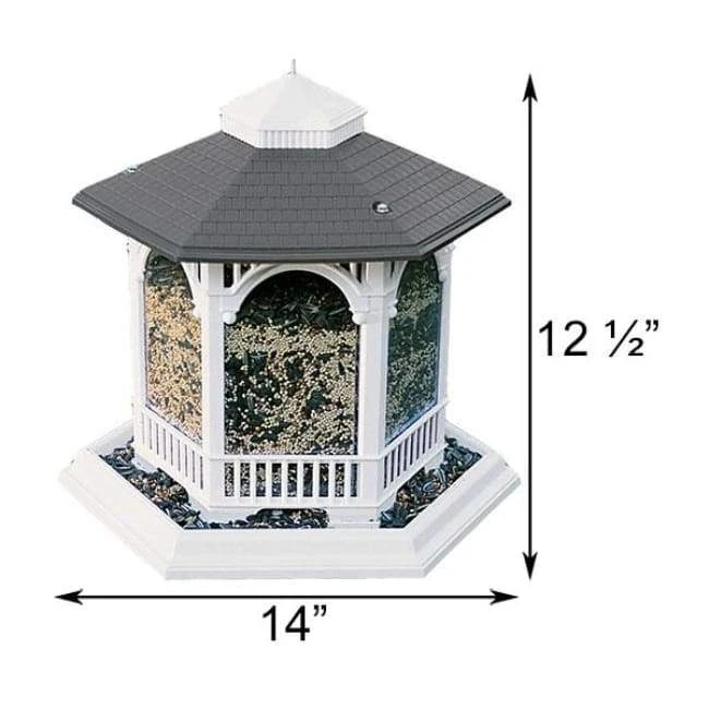 Add structure and fun to your bird garden with the Heritage Farms Deluxe Gazebo Bird Feeder. This engaging feeder offers birds a comfortable and detailed feeding spot. Each panel on this hexagonal shaped feeder has white fence along the top and bottom, as well as two orbs and a column between it and the next panel. A large white plastic base supports the reservoir, and a gray plastic roof with faux shingles tops the piece. A gap at the base of each panel enables seed to spill onto the tray, which is generously dotted with drainage holes for seed freshness. The reservoir holds 5 quarts of safflower, sunflower, or mixed seed, and the clear panels keep seed levels visible. This generous capacity will feed birds for several days, reducing trips outdoors to fill the item. The white cap at the top of the roof lifts for simple refilling, and the included cable allows the feeder to be hung virtually anywhere. Bring a charming look to your garden with this Deluxe Gazebo Bird Feeder. Made in the USA.Â