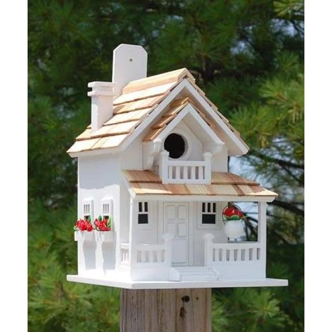 Share your outdoors with friendly avian neighbors by placing the Home Bazaar White Backyard Bird Cottage in your bird garden. The familiar architectural elements create a realistic shelter, while the white color brings a bright hint to your yard. The tall shape mimics a two story house, while the pitched roof, wraparound porch, and faux door and windows all evoke elements seen on homes throughout neighborhoods. Colorful fabric flowers in two window boxes and a hanging basket bring even more style to the piece, and wooden shingles on the roof contrast the white finish. A 1.25″ diameter entry sits near the top of the home, protected by the overhang from the roof and a dormer. The generous interior offers songbirds a wonderful roosting spot, and this tall design helps the nesting area stay cool. A drainage hole on the base allows any captured water to escape the unit, and the back panel removes easily for nest checks. Screening beneath the entry forms a ladder, allowing fledglings to reach it when ready to exit. This home’s wooden construction creates a hardy piece, and the flat base may be pole or post mounted with a mounting bracket (not included). Use the hanging tab on the back of the item to attach it to a tree, fence, or wall with just a screw for more display options. Start an avian neighborhood in your yard with this White Backyard Bird Cottage.