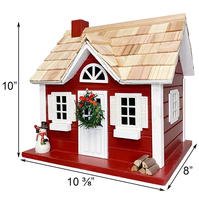 Bring holiday spirit to the forefront of your garden with this Home Bazaar Red Christmas Cape Bird House with LEDs. Placing this ornate, wooden shelter in your home or against your fence lends striking color to your setting, while the winter accents and integrated LEDs on it enhance the festive theme. A fabric wreath, snowman figure, and red and white color scheme bring the yuletide element into focus, and a wire with sporadic, orange toned LEDs along the roof line completes the adorable effect. Place 3 AA batteries (not included) in the hidden battery compartment to power these diodes, and turn the On-Off switch here with an auto timer to illuminate the piece for 6 hours each evening. This abode not only acts as a lovely addition to your holiday decorating; it also has a 1.25″ diameter entry hole on one side and an unpainted interior for a functional nesting box. Ventilation gaps, drainage holes, and a ladder below the entry hole complete the shelter, wonderfully meeting a bird’s needs. A generous back panel removes for nest checks and to reach the power source, and a hanging tab here swings upward for easy placement against a fence or wall. For a different look, nestle the piece within your miniature village, or add a mounting bracket (not included) to its base for pole or post mounting. The pitched, shingled roof perfectly offsets the red chimney shape, and a white soffit, door, and window frames complement the rest of the red home. Gift your favorite songbirds a beautiful and thematic roosting spot with this Red Christmas Cape Bird House with LEDs.