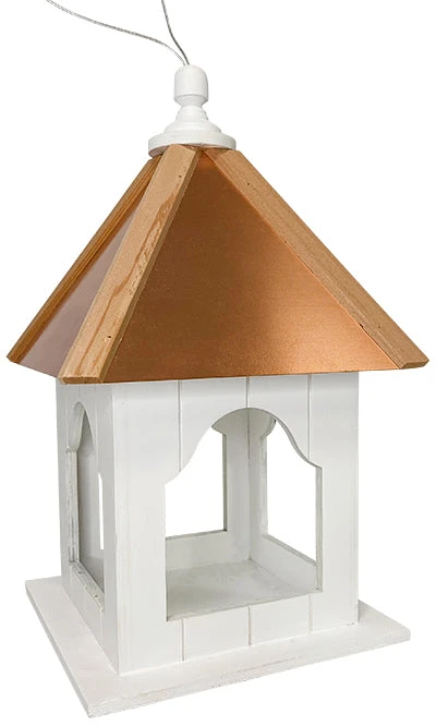 Bring familiar shape and bright color to your garden while providing a buffet to your feathered friends with this Home Bazaar Madison Hanging Platform Feeder with Copper Roof. A white body, copper covered roof, and cedar tines combine for a bold look, while creating a dining haven for several birds. The platform holds 0.25 quarts of seed, fruit, mealworms, or suet, and a drainage hole in the center keeps feed fresh. The 3.5″ wide and 4″ tall opening on each side creates a fly-through design for smaller birds, allowing plenty of them to dine easily. The hipped, wooden roof fully covers the reservoir, and copper panels atop the frame offer shine. Cedar tines complete this section, and a white finial keeps the attached, plastic coated cable centered perfectly. Use this cable to hang the feeder from a branch, or affix a mounting plate (not included) to the base for pole or post mounting. Its open sides keep all the avian activity visible, and the wooden body increases the natural materials in your yard. Combine timeless style with a lasting hobby by placing this Madison Hanging Platform Feeder with Copper Roof in your lawn.