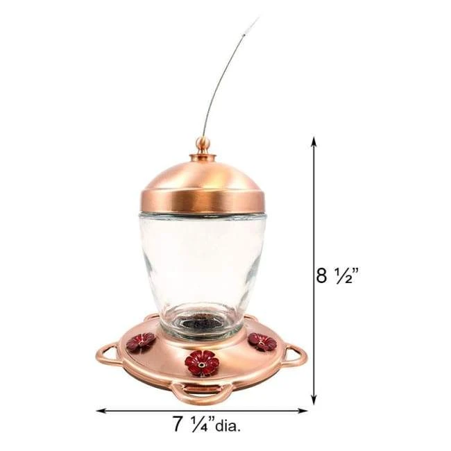 Lift your hummingbirds’ spirits by placing the More Birds Jubilee Hummingbird Feeder in your garden. The rounded shape and copper colored accents on this feeder lend a wonderful shine to your backyard, while keeping plenty of nectar available for your feathered friends. The glass bottle flares outward toward the top, holding a generous 32 ounces of nectar, and a flattened, saucer style base completes the unit. Five red, metal flower shapes adorn this base, for a few birds to dine at once, and a perch extends by each for resting spots. The copper color on this saucer, along with the matching cap, easily captures attention, and the top, rounded finial adds a fun hint. A metal cable extends from this finial, allowing you to hang the feeder from a hook, and the reservoir unscrews from the saucer to clean or refill it. Nectar levels remain visible at a glance thanks to the clear glass bottle, and the red and copper colors perfectly enhance your foliage. Invite hummingbirds to congregate in your garden with this Jubilee Hummingbird Feeder.