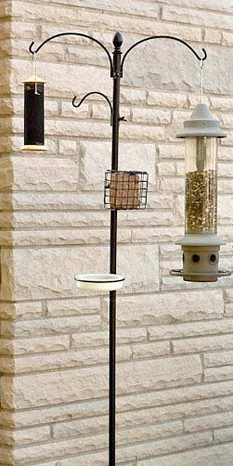 Turn your yard into a bird sanctuary in moments with the Panacea Wild Bird Feeding Station Kit. This station includes hooks, hangers, and other accessories to easily meet all your birding needs. A tubular steel pole forms the body of the unit, with dual 10″ hooks at the top to accommodate two different bird feeders (not included) up to 18″ in diameter. Attach the included 5″ hook to the shaft as well to hang another feeder or small garden accessory. For more avian visitors, connect the included suet cage to the main pole, and tighten the attached wing nut to keep it in place. A 6.75″ diameter, clear plastic bird bath and hanger ring are also included for you to offer your birds fresh water. The 1.25″ depth of the bath is perfect for small birds to bathe, and it removes from the ring easily for cleaning or refilling. Each included accessory may be positioned differently on the pole, or removed if you prefer not to use it, for a completely customizable item. The tubular steel pole and accessories withstand the elements, and the black color keeps the unit timeless. Stake the pointed end of the pole into the ground for stability, ensuring the station remains visible for you. Create a bird haven in any yard using this Wild Bird Feeding Station Kit. Assembly required.