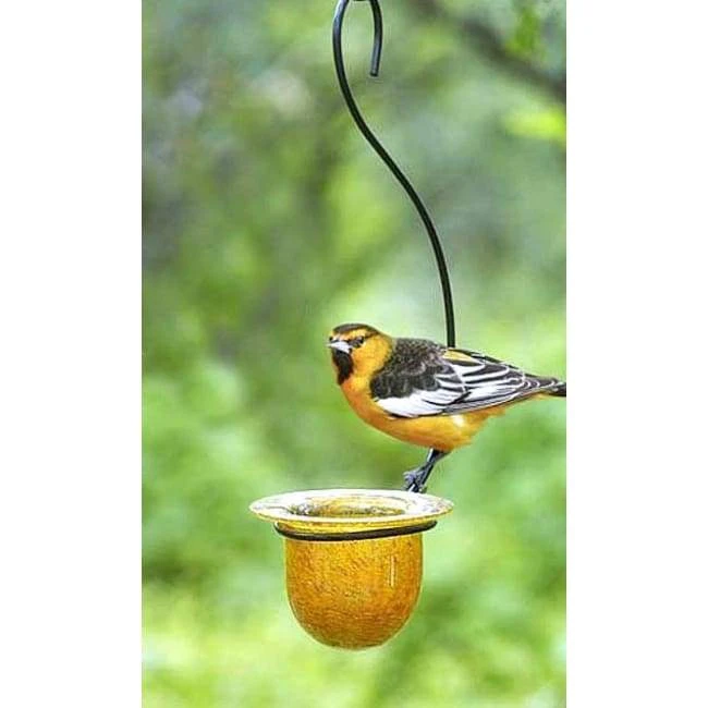 Invite orioles to frolic and dine in your yard with the Parasol Medium Mandarin Recycled Glass Oriole Feeder. This artistic unit will enliven your bird garden, while its vivid colors create an individual style. A curved, black metal hanger brings a hint of design to the piece, and its base holds the blown glass dish. This vessel holds 0.667 cups of jelly, mealworms, fruit, nectar, or a variety of seed, offering food to a wealth of different birds. Vivid orange lines and dots throughout the clear glass dish help attract orioles, and its iridescent finish lends more dimension to this item. The dish removes from the hanger in moments, to thoroughly clean and refill it. Use the included, 2.25″ “S” hook to hang this item from a bracket. Crafted from hand blown, recycled glass, the item lends an environmentally-savvy hint to your yard while remaining lovely and functional. Display exciting color and design in your yard with this Medium Mandarin Recycled Glass Oriole Feeder.