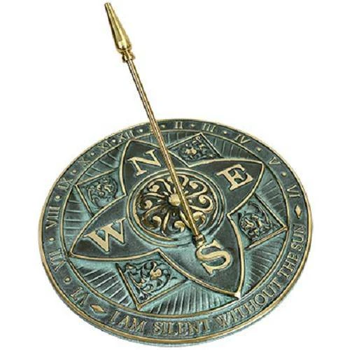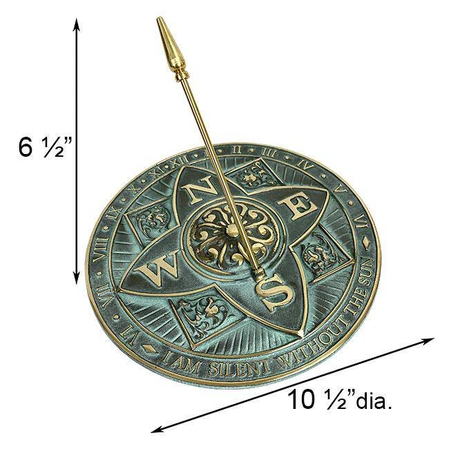 Direct attention to your garden décor with this Rome Brass Rosette Sundial. Placing a sundial in your garden adds fantastic ornamentation and a unique timepiece to it, and this unit celebrates both wind and sun. A raised rosette accent occupies the center of the dial, surrounded by compass arrows and the letters N, E, S, and W. A square detail with raised frame sits behind these directionals, and a raised floral accent in each corner enhances the center rosette. An outer rim has a band of Roman numerals from 6 AM to 6 PM, as well as the phrase “I am silent without the sun” at its base. A generous, brass gnomon installs easily into the threaded port on the dial, and creates a shadow over the numerals for fantastic timekeeping. Orient this item celestial north in your garden for an accurate timepiece. Its brass construction remains durable for seasons of outdoor use, and its bold verdigris color enhances your shrubs. The polished brass, raised accents add a bit of shine to the garden, and the item may be placed on the ground or attached to a Rome pedestal (not included) with its included hardware. Bring classic style and timekeeping to your garden with this Brass Rosette Sundial.