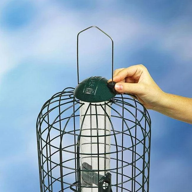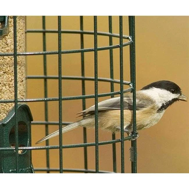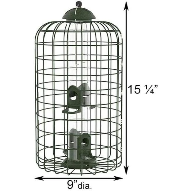 Provide your backyard birds with a squirrel-free feeding sanctuary using the Stokes Squirrel Resistant Bird Feeder. Adding a caged feeder to your bird garden places a physical barrier between seed and squirrels, discouraging them from dining. This lasting, metal cage surrounds the clear plastic seed tube, which is perfect for offering birds 1.25 quarts of sunflower seed or a seed blend. Four reinforced feeding stations, each with ergonomic perches for avian comfort, allow a few birds to dine at once. A die cast, metal lid keeps the seed protected from rain, and an innovative locking system here prevents squirrels from lifting the cap and stealing seed. The deep green, 1.5″ square mesh around this tube adds an extra squirrel deterrent, stopping them and larger birds from reaching the feed, while ensuring the reservoir remains easily visible. An internal baffle at the base of the seed tube directs it to each port, so the unit empties completely, and the deep green finish on the cage and cap enhance your backyard. These wonderful features ensure a durable and thoughtful feeder, perfect for keeping squirrels at bay. A port on the base accepts a 1″ outer diameter pole, to pole mount the unit, and the attached metal loop allows you to hang the item easily. The lid lifts up this attached hanger for refilling or cleaning, for a feeder you will enjoy year after year. Stop squirrels from dining using this Squirrel-Proof Bird Feeder.Â