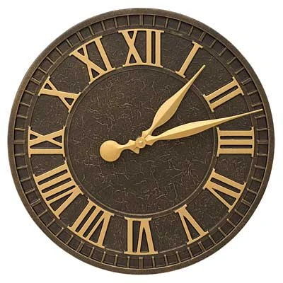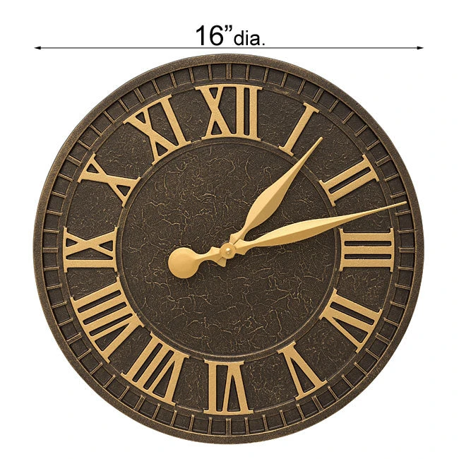 Place a classic and precise adornment on your home or outdoor wall using this Whitehall Geneva Wall Clock. This generous, 16″ diameter unit captures attention with ease, enhanced by its Roman numerals and timeless color scheme. The gold tones of the numerals remain visible against the dark bronze background, and matching, gold colored hands clearly indicate the time. The textured face of the item lends dimension and unique style to your wall, while the aluminum construction provides versatility in placing the piece. An included hanger allows the clock to be wall mounted in moments, and the included, AA battery powers the timepiece. Easily measure time spent in your home or garden using this Geneva Wall Clock. Made in the USA.