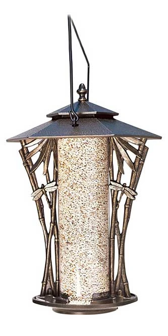 Invite birds to feast in your backyard with the Whitehall Dragonfly Silhouette Bird Feeder. Dragonflies rest on reeds, which mirror each other on opposing sides of the feeder. The clear plastic feeder tube keeps the seed levels visible at all times and can accommodate two and a half quarts of seed. Two large seed ports spill seed onto the 8″ diameter tray where birds have plenty of room to eat and perch. A hammered finish in both the top and bottom add texture to the feeder, while enhancing the incredible detail in the dragonflies and reeds. Unlike more traditional tube feeders, this feeder features a double pagoda-influenced roof, one of which may be removed easily for filling and cleaning. The recycled aluminum roof and tray display a beautiful weather resistant finish that will keep this feeder a bird favorite for many years. The Whitehall Dragonfly Silhouette Bird Feeder may be hung on the included 7″ metal loop hanger. Some assembly required. Made in the USA.Â