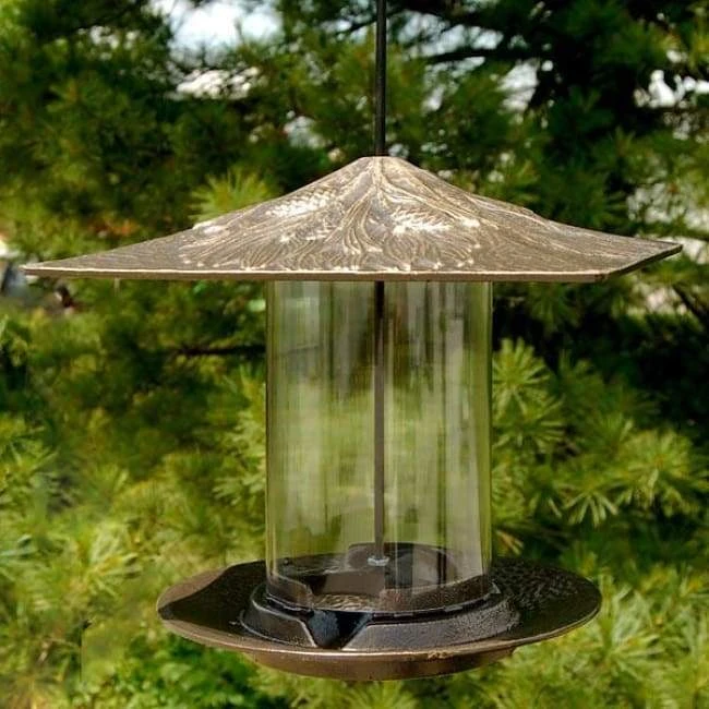 Watch the birds in your backyard feast from the Whitehall Pinecone Tube Bird Feeder. Three dimensional pinecones, needles, and branches seem to dance across the 9.5″ square roof, which protects the seed from the elements. The clear plastic seed tube holds one and a quarter quarts of seed, and offers easy monitoring of seed levels. The three small seed ports at the base of the tube allow birds to have easy access to the seed, and the round 8.25″ diameter base acts as a perch for your feathered friends. Simply slide the roof up the included black powder coated steel hanger for easy cleaning and filling. The recycled aluminum roof and tray are weather resistant and will provide enjoyment for many years. Made in the USA.Â
