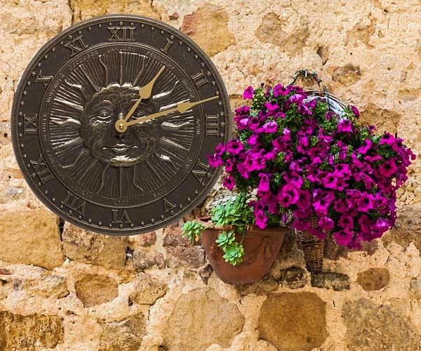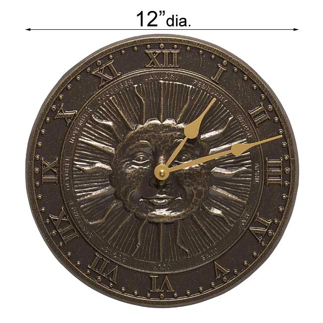 Brighten your day with the Whitehall Sunface Clock. The months of the year form a smaller circle inside the hours, with the smiling sunface’s rays radiating toward them. Large Roman numerals and tick marks line the perimeter and are easily viewed from across a room or patio area. This timepiece’s solar theme will surely complement any home or outdoor sanctuary. The recycled aluminum construction and durable finish ensure that this clock will look great whether hanging in your home or patio. Operates from a single AA battery (included). Made in the USA.