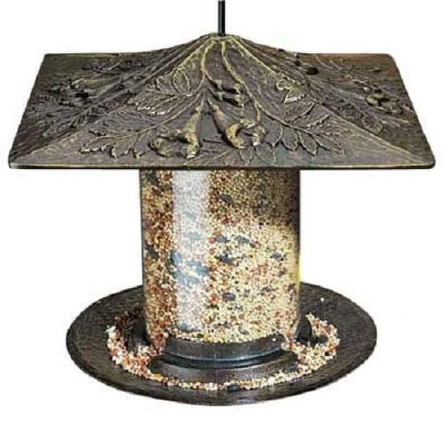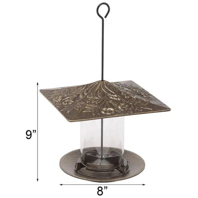 Announce the presence of bird seed using the Whitehall Trumpet Vine Tube Bird Feeder. Eight blooming flowers appear on a decorative vine that twists across the square feeder roof, which protects the seed from the elements. The clear plastic tube holds one and a quarter quarts of seed, and offers easy monitoring of feed levels. The three small ports at the base of the tube allow birds to have easy access to seed, and the round 8″ diameter base acts as a perch for your feathered friends. Simply slide the roof up the included black powder coated hanger for easy cleaning and filling. The recycled aluminum roof and tray are weather resistant and will provide enjoyment for many years. Made in the USA.Â