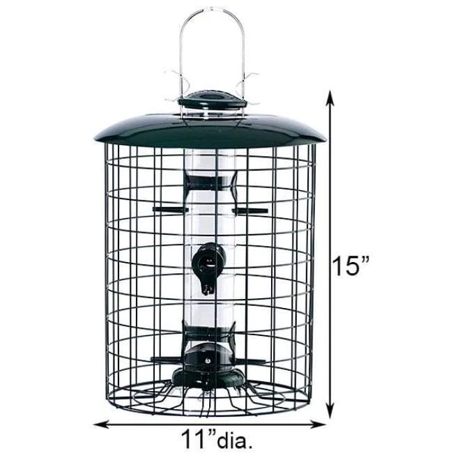 Help birds enjoy seed without squirrels taking it using the Woodlink Caged Seed Tube Bird Feeder. This sturdy feeder provides a safe haven for small songbirds, allowing them to dine without squirrels. The 1.375″ fencing creates perching for lots of small songbirds while preventing squirrels and larger birds from feeding. The feeder tube is made of durable polycarbonate plastic that is perfect for 1 quart of sunflower seed or mixed seed. The six reinforced feeder ports have individual perches, offering a convenient resting or dining spot. The flow-through base prevents seed from collecting, so that squirrels are not enticed to cling and feed. The large metal roof and cap help to prevent squirrel damage and serve to keep seed dry and fresh, while the forest green color blends with any setting. The ingenious lock on the roof keeps animals from lifting the cap and reaching into the tube, pilfering seed. Use the attached 4″ metal hanger to hang this feeder. Offer seed only to birds with this Caged Seed Tube Bird Feeder.Â